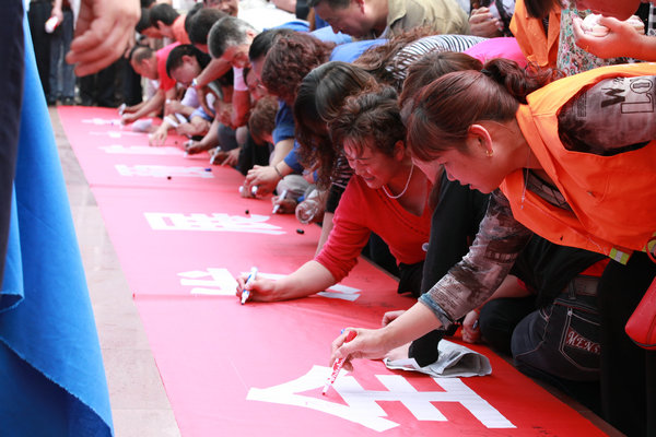 家屬協(xié)管在印有安全發(fā)展的橫幅上簽名