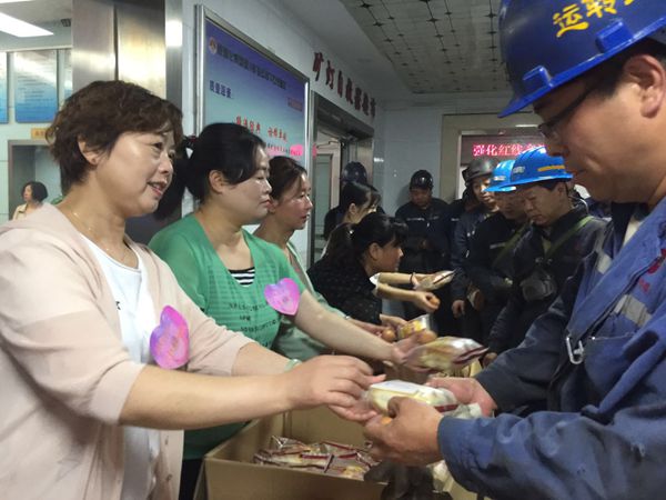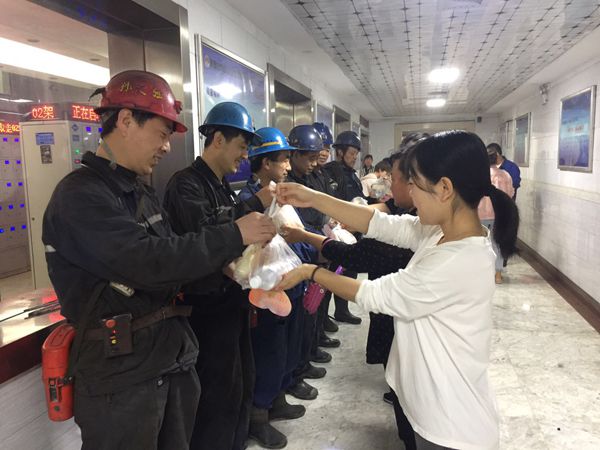 6月20日早上七點(diǎn),天空細(xì)雨纏綿不斷,正如礦嫂們對(duì)丈夫絲絲縷縷的牽掛一樣,井口安全文化長(zhǎng)廊20多名礦嫂、女職工們精心準(zhǔn)備著“愛(ài)心禮包”,她們將面包、雞蛋、水等食物提前擺放整齊,為每名入井的職工準(zhǔn)備了一份溫情脈脈的早餐,翹首以盼,懷著熱切的心情,等待著正在召開(kāi)班前會(huì)的丈夫。讓礦工兄弟們帶著愛(ài)的食物和親人的囑托,牢記安全為天思想,深入井下嚴(yán)格落實(shí)各項(xiàng)安全規(guī)程措施,堅(jiān)持按章作業(yè),安全發(fā)展。