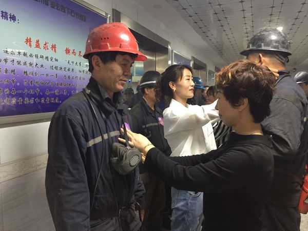 下午4點(diǎn),安全協(xié)管員、女工家屬又早早的來(lái)到井口,手拿毛巾、香皂等物品等待著升井的丈夫。伴隨著嘈雜聲和膠靴踏向地板的噠噠聲,他們最親愛(ài)的人升井了,然而礦嫂們竟都愣住了,他們從來(lái)沒(méi)有見(jiàn)過(guò)剛升井的礦工的樣子,一樣的工作服、一樣黝黑的臉龐、一樣雪白的牙齒,一下子竟分辨不出哪個(gè)是自己要找的他。當(dāng)滿臉漆黑的丈夫走到自己面前時(shí),妻子再也抑制不住自己的情緒,眼淚奪眶而出,哽咽著抱著自己的丈夫,說(shuō):“為了我們這個(gè)家,你辛苦了?!彼查g,井口文化長(zhǎng)廊被親情和溫暖所包圍和彌漫著。她們等待著丈夫洗去一身的疲憊后,一起踏著廣播中《一生有你》的節(jié)拍走向“愛(ài)的港灣”。