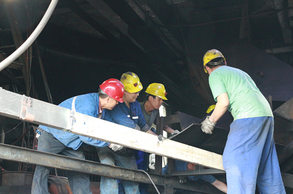 該礦洗選區(qū)按照工作計劃迅速將工器具運輸?shù)浆F(xiàn)場,物資材料使用經(jīng)修復的電滾筒、托輥、皮帶架子,頂高溫冒酷暑進行電焊作業(yè)。經(jīng)過近5個小時的連續(xù)奮戰(zhàn),4號轉運站落地皮帶恢復運行,為運輸系統(tǒng)提供了可靠保障。