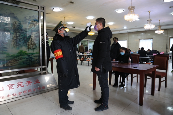 “各位師傅們,請(qǐng)保持1米以上的距離,依次進(jìn)行體溫測(cè)量,有序進(jìn)入。”早上7點(diǎn),在該礦職工食堂大門口,就聽(tīng)見(jiàn)執(zhí)勤的救護(hù)隊(duì)隊(duì)員不停地喊著。以前密集排隊(duì)就餐、圍坐在餐桌上吃飯聊天的場(chǎng)景不見(jiàn)了,取而代之的是就餐職工經(jīng)過(guò)體溫測(cè)量,間隔排隊(duì)打飯后,單人單桌,互不照面的就餐習(xí)慣。