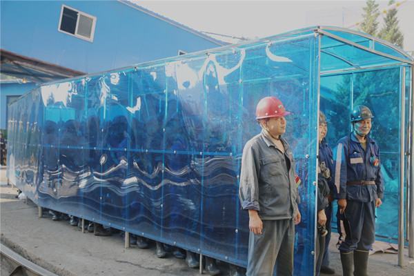 據(jù)了解,該礦候車廳位于礦井井口處,長12.5米,寬2.2米,高2.5米,為不銹鋼柜架和鋁板藍(lán)色耐力板焊接而成,它不僅美觀,還能遮擋烈日陽光和防止雨水侵襲,有美化礦區(qū)環(huán)境和遮風(fēng)避雨的雙重功能。為等候下井的職工提供一處小小的陰涼之所,讓職工消除精神和心理上的急迫感和壓力感,才能保持良好和穩(wěn)定的精神狀態(tài)在井下安安全全干工作。