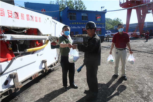 早9時(shí)30分,在該礦區(qū)井口工業(yè)廣場(chǎng)龍門吊下,礦黨政班子成員帶領(lǐng)著黨群部工作人員,親手將一份份含有白糖、茶葉、藿香正氣水、清涼油和蚊香的暖心大禮包,分別遞到了正在工作崗位上忙碌的職工們手中,并囑咐他們做好個(gè)人防護(hù),保持好充足的精力和體力,干好本職工作。