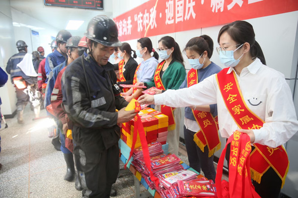 “師傅,您辛苦了,請吃塊月餅,中秋節(jié)快樂,在井下作業(yè)時一定要按章作業(yè),杜絕違章”。在慰問現(xiàn)場傳來了女工協(xié)管員們的一聲聲的安全叮囑和節(jié)日問候。 下午14時50分,身披鮮紅綬帶女工協(xié)管員,帶著礦黨政的深情囑托和深深祝福,為上下井的職工們親手送上了暖心月餅、愛心鞋墊和出入平安紅腰帶,并為他們送上節(jié)日的祝福,叮囑大家要勞逸結(jié)合,保持好充沛的體力和精力,為家庭的幸福和礦井的發(fā)展,在井下作業(yè)期間時上標準崗、干放心活,時刻一名思想和行為上的安全人。