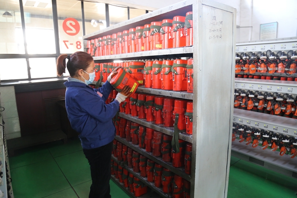 走進(jìn)礦燈房,首先映入眼簾的是整潔明亮排列有序的燈架,以及穿著工裝、掛牌上崗的女工們和她們忙碌有序的身影。她們平均年齡35歲,是一支充滿朝氣、銳意進(jìn)取、團(tuán)結(jié)協(xié)作、積極向上的隊(duì)伍。 每天,她們上班的第一件事情就是拖地,打掃衛(wèi)生,之后就開始用毛巾擦拭一盞盞礦燈,查看礦燈和自救器是否正常,充電指示燈是否正常,把存在的隱患一一排除后,再把礦燈放入燈架上充電,充滿電的礦燈才能讓職工放心使用。