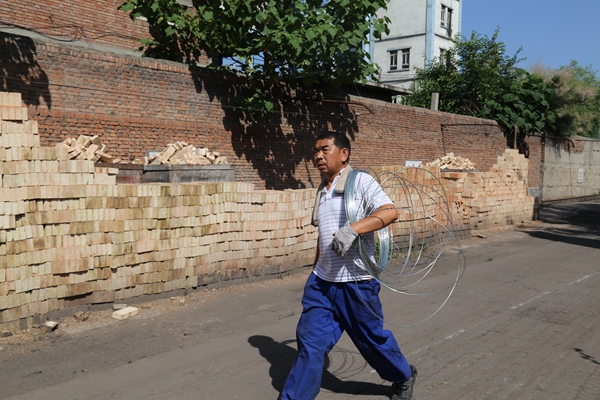 為了保障設(shè)備及時裝車,一名職工不顧高溫炎熱,加緊步伐,肩扛鐵絲,準備對平板車上的設(shè)備進行加固,汗水已濕透全身,他脖子上搭著的一條毛巾,隨時擦汗用。