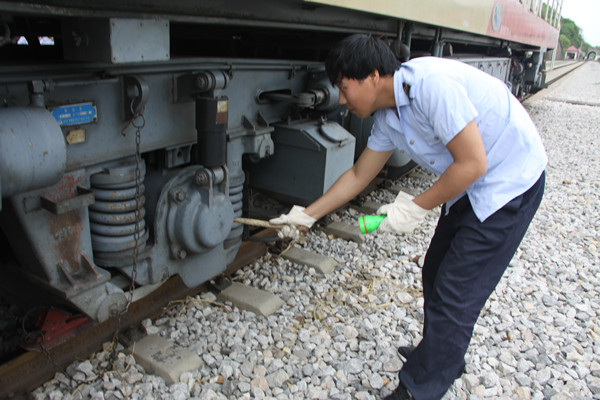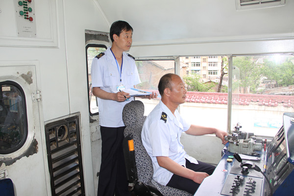 在該車站兩道處,裁判員、高級(jí)工程師洪俊海、車間主任張波在現(xiàn)場拿著檢查考核表,觀看著每個(gè)選手的比試。副司機(jī)于洋、張隧臣、牛證,手持尖嘴錘和手電筒先到內(nèi)燃機(jī)車上檢查有關(guān)部位,隨后開始檢查機(jī)車的行走部的彈簧是不是變型、螺絲是不是松動(dòng)、儀器是不是準(zhǔn)確、沙箱里是不是有雜物,最后填寫所有檢查結(jié)果。最終,他們以優(yōu)異成績榮獲該項(xiàng)目崗位尖兵、二等獎(jiǎng)、三等獎(jiǎng)。