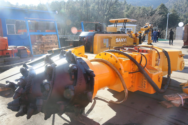 該礦引進(jìn)的YBUS-230/6懸臂式掘進(jìn)機(jī),體長10.44米,高度1.72米,重65噸,截割面積25平方米,主要由截割機(jī)構(gòu)、裝載機(jī)構(gòu)、運(yùn)輸機(jī)構(gòu)、機(jī)架及回轉(zhuǎn)臺(tái)、行走機(jī)構(gòu)、液壓系統(tǒng)、電氣系統(tǒng)、冷卻滅塵系統(tǒng)及機(jī)器的操作控制與保護(hù)等九大部分組成。該設(shè)備機(jī)身小巧在巷道內(nèi)具有靈活性,可實(shí)現(xiàn)連續(xù)開挖,尤其在井下煤巷中能夠截割巷道全斷面,不僅速度快還效率高,該設(shè)備工作中通過炮頭截割將煤從煤體中分離后,經(jīng)刮板輸送機(jī)和膠帶輸送機(jī)完成裝載運(yùn)輸工作。