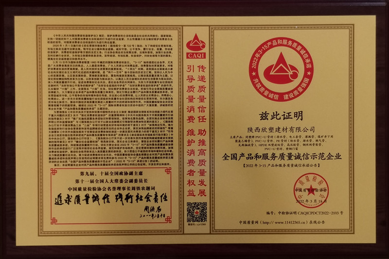 該公司自成立以來,便始終秉承“誠信為本,質(zhì)量第一”的經(jīng)營理念,致力于為廣大用戶提供綠色環(huán)保、低碳節(jié)能的建材產(chǎn)品和優(yōu)質(zhì)服務。特別是近年來,實施“以質(zhì)量創(chuàng)品牌,以品牌拓市場”戰(zhàn)略,高度重視產(chǎn)品和服務質(zhì)量管理,修訂完善《產(chǎn)品質(zhì)量管理辦法》,建立健全客戶服務體系,落實“五級”質(zhì)保責任,進一步明確責任,細化考核,促進質(zhì)量責任層層落實。嚴格執(zhí)行ISO9001質(zhì)量管理體系,推行卓越績效管理模式,大力開展QC創(chuàng)新、技能對標、崗位評定、技術(shù)比武等一系列質(zhì)量提升活動,不斷提升質(zhì)量管理水平,確保產(chǎn)品質(zhì)量合格穩(wěn)定,PE鋼絲網(wǎng)骨架管、PVC和PE瓦斯抽放管等礦用產(chǎn)品的阻燃、抗靜電、拉伸屈服強度等關(guān)鍵指標處于國內(nèi)先進水平,先后榮獲了“陜西省質(zhì)量信譽AAAAA單位”“陜西省名牌產(chǎn)品”“全國管材管件行業(yè)質(zhì)量領(lǐng)先品牌”“全國質(zhì)量檢驗信譽保障產(chǎn)品”等殊榮。