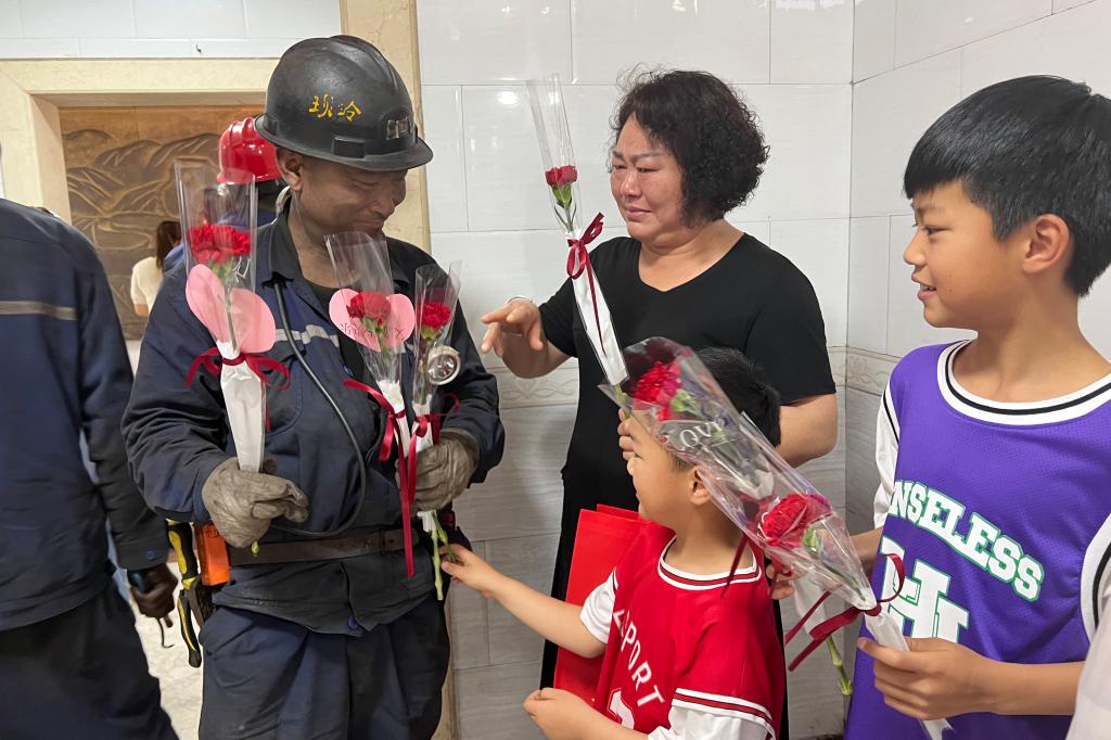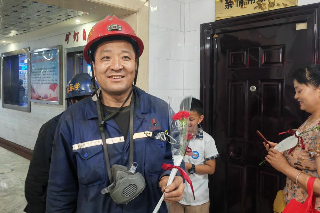 下午四時(shí),八點(diǎn)班的職工升井了,20名等待已久的礦工家屬兒女們,第一時(shí)間在人群中找尋自己的親人,遞上一束“父親節(jié)快樂”的鮮花,走到了自己的親人身邊,用毛巾給丈夫和父親拭去滿面的煤灰。“我從來沒有見過丈夫升井時(shí)的樣子,為了我們這個(gè)家,辛苦了?!?/span>