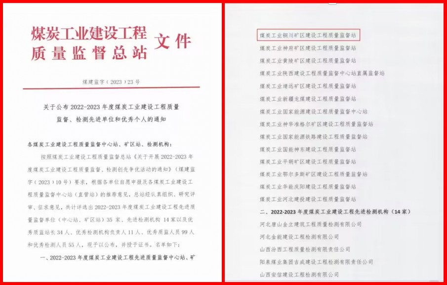 近日,煤炭工業(yè)銅川礦區(qū)建設(shè)工程質(zhì)量監(jiān)督站在全國(guó)2022—2023年度煤炭工業(yè)建設(shè)工程質(zhì)量監(jiān)督、檢測(cè)“創(chuàng)先爭(zhēng)優(yōu)”活動(dòng)中喜獲佳績(jī),榮獲全國(guó)煤炭工業(yè)建設(shè)工程先進(jìn)質(zhì)量監(jiān)督礦區(qū)站榮譽(yù),同時(shí)銅川礦區(qū)站站長(zhǎng)艾龍龍同志榮獲優(yōu)秀站長(zhǎng)榮譽(yù)、銅川礦區(qū)站解宇哲同志榮獲優(yōu)秀質(zhì)量監(jiān)督專(zhuān)業(yè)人員榮譽(yù)。