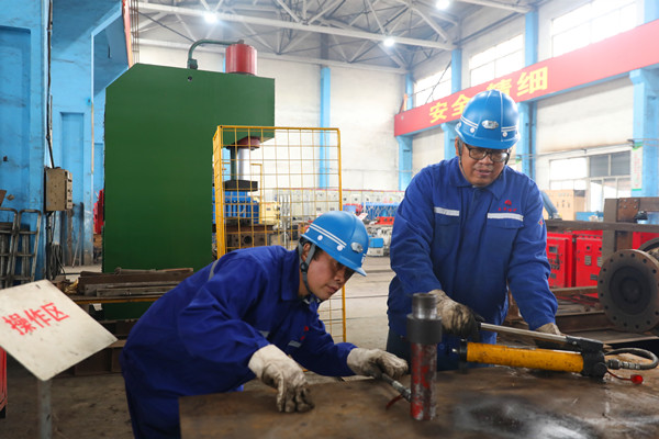 該礦機(jī)加工車間職工岳永軍,依靠多年加工器具的工作經(jīng)驗,提出了通過液壓系統(tǒng)產(chǎn)生壓力來完成拆卸工作的思路,通過精心設(shè)計、反復(fù)試驗,并不斷優(yōu)化改進(jìn),打造出一款專用扒具。在拆除耦合器時,將扒具的接口連接到液壓泵上,扒具口對準(zhǔn)需要拆除的零部件卡口位置,打開液壓系統(tǒng)開關(guān),液壓油進(jìn)入扒具油缸,扒具收縮產(chǎn)生強(qiáng)大拉力,從而能夠依靠機(jī)械力輕松拆除零部件。