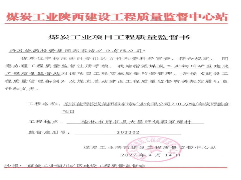 近日,銅川礦區(qū)工程質(zhì)量監(jiān)督站受省能源局煤炭工業(yè)陜西建設(shè)工程質(zhì)量監(jiān)督中心站指派,對府谷能源投資集團郭家灣礦業(yè)有限公司210萬噸/年資源整合項目實施質(zhì)量監(jiān)督管理。