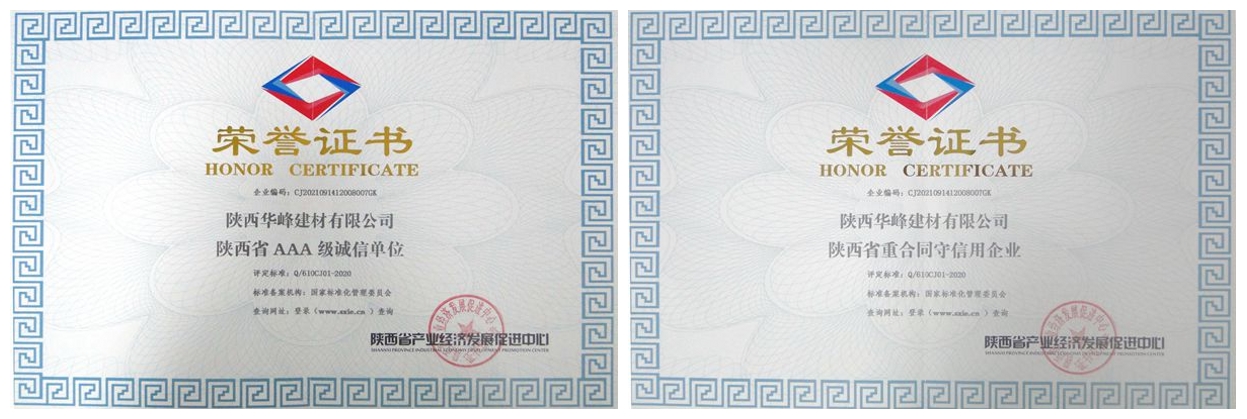 近日,從陜西省產(chǎn)業(yè)經(jīng)濟(jì)發(fā)展促進(jìn)中心獲悉,華峰公司被評(píng)為2021年度陜西省“重合同守信用企業(yè)”及“陜西省AAA級(jí)誠(chéng)信單位”。榮譽(yù)的獲得,是公司高度重視合同管理和社會(huì)誠(chéng)信體系建設(shè)的結(jié)果,為公司今后持續(xù)健康、快速發(fā)展提供了更加有力的信譽(yù)保障。