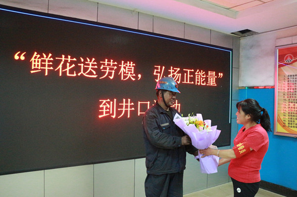 “師傅,您辛苦了!我代表職工家屬感謝您一直以來的辛勤工作,祝您工作順利,健康平安?!迸f(xié)管員一邊對(duì)入井人員進(jìn)行安全叮囑,一邊遞上了鮮花。