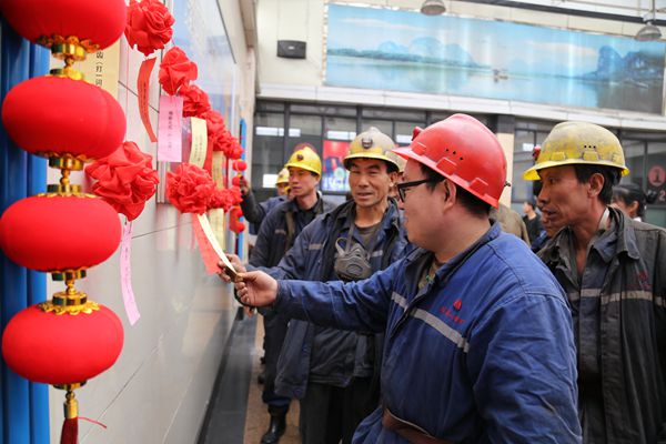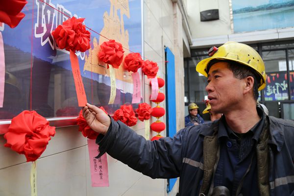 “老袁,快來(lái)看這個(gè),幫幫我,答對(duì)了獎(jiǎng)品算你一半,正好也跟你學(xué)習(xí)學(xué)習(xí)。”“讓我想想啊,嗯,嗯……不按曲譜彈琴,應(yīng)該是違章操作吧?”綜掘二隊(duì)楊先方雙手拉著工友袁復(fù)軍的胳膊,兩人如同小孩子一般,開(kāi)工前也樂(lè)呵呵了起來(lái),大紅的燈籠懸掛人群的兩側(cè),歡聲笑語(yǔ)讓錚錚鐵骨露出柔情的一面。
