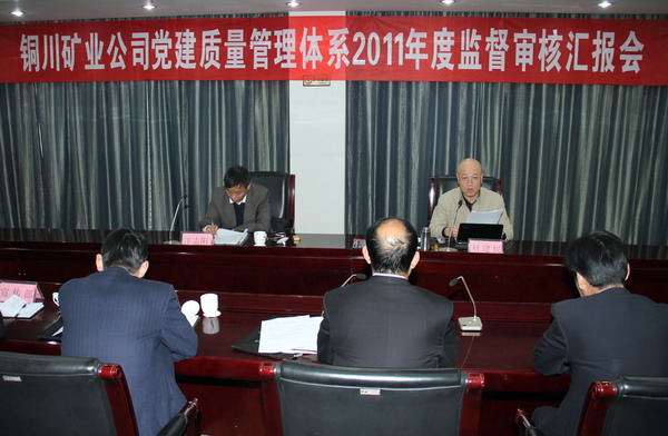 當(dāng)天上午,公司黨建質(zhì)量管理體系2011年度監(jiān)督審核匯報(bào)會(huì)在煤業(yè)賓館3號(hào)樓二樓會(huì)議室舉行。劉建民、王志陽出席會(huì)議,礦業(yè)公司黨委書記黃河主持會(huì)議并致辭;礦業(yè)公司黨委組織部部長王志鋒就我公司2011年度黨建質(zhì)量管理體系運(yùn)行情況作專題匯報(bào)。礦業(yè)公司黨建質(zhì)量管理體系辦公室、黨委組織部、黨委辦公室、紀(jì)委監(jiān)察室、黨委宣傳部、團(tuán)委、礦區(qū)工會(huì)、信訪辦、保衛(wèi)部、礦工報(bào)社等黨群部門負(fù)責(zé)人,鴨口煤礦有限責(zé)任公司、徐家溝煤礦有限責(zé)任公司、金華山礦、鐵路運(yùn)銷分公司4個(gè)接受審核的單位黨委書記,礦業(yè)公司黨群各部門內(nèi)審員等參加了會(huì)議。