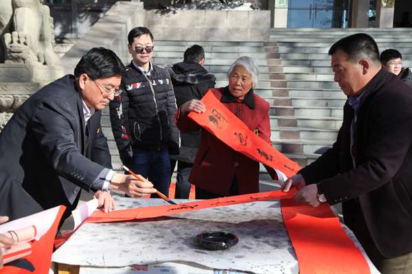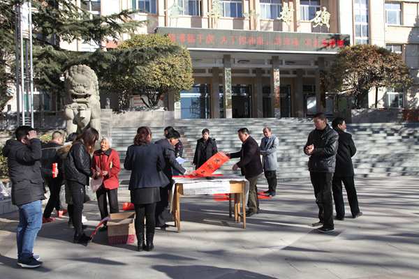 活動(dòng)現(xiàn)場(chǎng),武書記擺開桌案,鋪上紅紙,筆走龍蛇、揮灑筆墨,前來(lái)討要春聯(lián)的職工家屬一邊等候,一邊欣賞武書記的書法作品。職工家屬有求必應(yīng),一副副滿含吉祥祝福的春聯(lián),一個(gè)個(gè)大紅的“?!弊郑瑸槟晡妒愕暮椭C穩(wěn)定礦區(qū)增添了一道靚麗的風(fēng)景線。