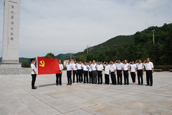 在馬欄革命紀(jì)念碑前全體黨員莊嚴(yán)舉起右手,面對(duì)鮮紅的黨旗,重溫入黨誓詞。