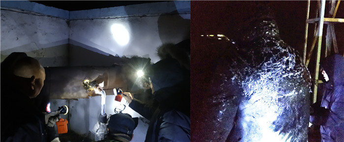 第一組轉(zhuǎn)運(yùn)自來水進(jìn)行有序。第二組進(jìn)行焊接異常艱難,架空管路先進(jìn)行化冰排水,在滴水成冰的條件下,焊接人員裹上了一身“冰甲”仍在堅持作業(yè)。物業(yè)公司經(jīng)理、支部書記帶隊第三組攻堅,每名黨員干部分包一段管路清塞,并逐漸將搶修范圍擴(kuò)展至2000余米。