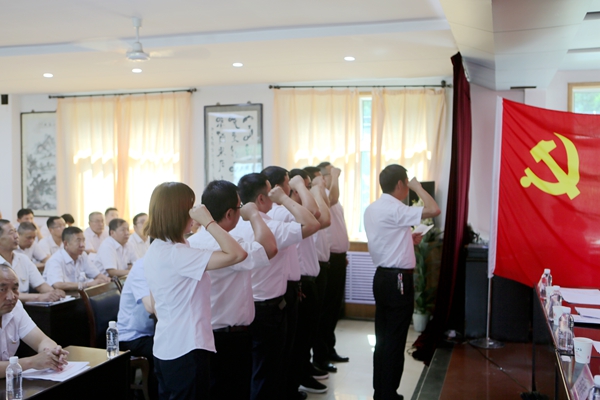 會上,納新黨員在鮮紅的黨旗下進行了莊嚴(yán)的宣誓。