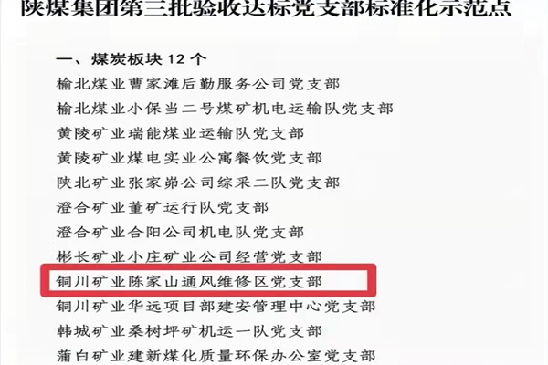 近日,陜煤集團黨委下發(fā)文件,公布了第三批驗收達標黨支部標準化示范點,陳家山煤礦通風維修區(qū)黨支部榜上有名,被確定為陜煤集團第三批“黨支部標準化示范點”稱號。