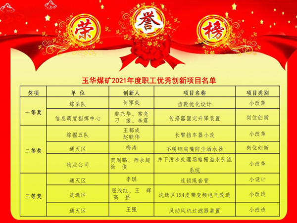 玉華煤礦2022年“五會”上,經(jīng)過層層推薦評定,8個“五小”及職工創(chuàng)新項目憑借助力安全生產(chǎn)的良好實用性及經(jīng)濟(jì)效益,自60個創(chuàng)新項目中脫穎而出,摘得了廣受關(guān)注的礦井2021年度創(chuàng)新大獎,創(chuàng)新舞臺群星閃耀,創(chuàng)新熱詞引領(lǐng)風(fēng)潮。
