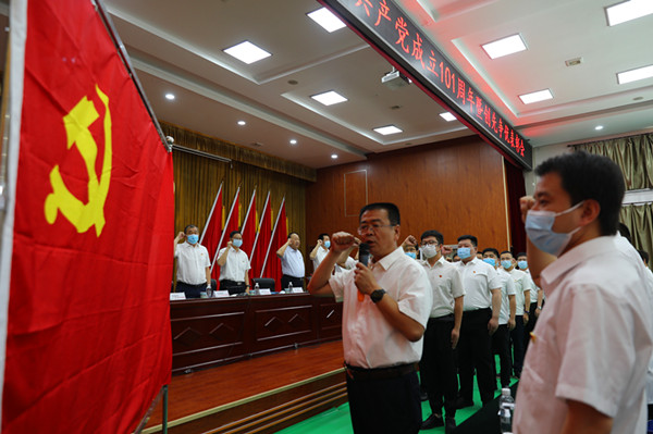 上午10時(shí),大會在雄壯的國歌聲中開幕。 24名納新黨員面對黨旗,舉起右拳進(jìn)行了莊嚴(yán)的入黨宣誓,全體參會人員重溫入黨誓詞。