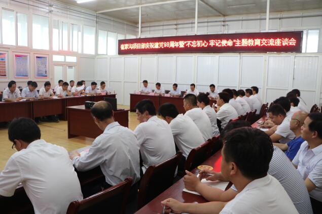 7月1日下午,崔家溝項目部召開慶祝建黨98周年暨“不忘初心 牢記使命”主題教育交流座談會,該項目部領導班子、各副總、各黨支部書記、副書記、副科級以上黨員干部及納新黨員共60余人參加。