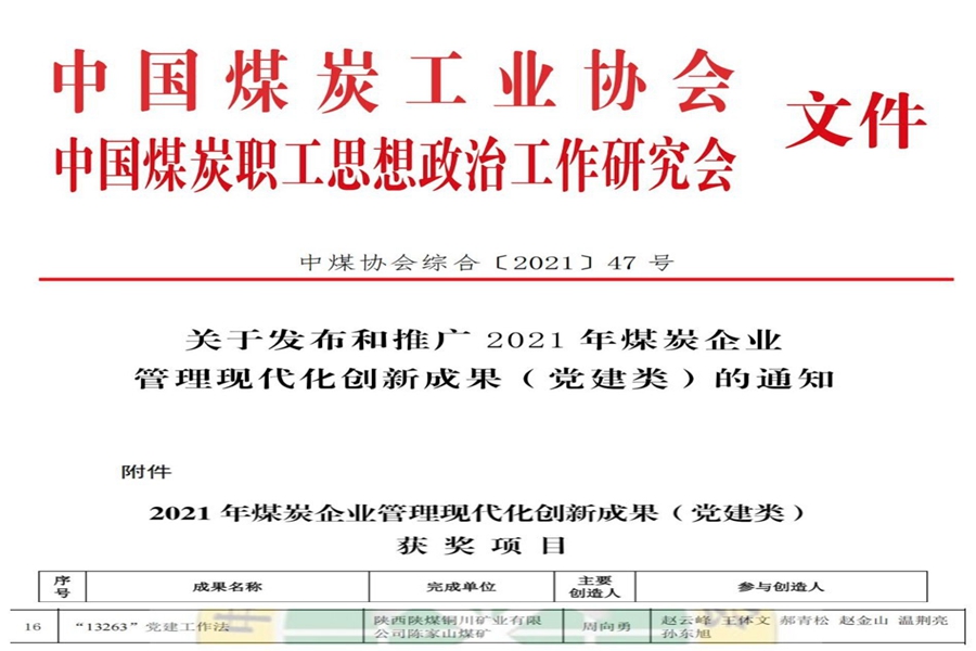 近日,從中國煤炭工業(yè)協(xié)會(huì)、中國煤炭職工思想政治工作研究會(huì)獲悉,陳家山礦《“13263”黨建工作法》榮獲2021年煤炭企業(yè)管理現(xiàn)代化創(chuàng)新成果(黨建類)二等獎(jiǎng)。
