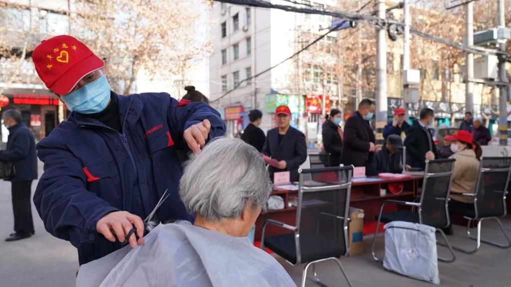 “門口就能量血壓,真是太方便了,感謝你們這幫年輕人……”“不著急,量完血壓,再剪個短發(fā),顯得精神……”志愿者小李正扶著王大爺準備理發(fā)。