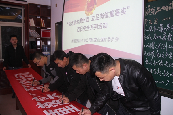 10月1日早7點,在陳家山煤礦綜采隊、綜掘三隊學習室,8點班的青年干部職工早已做好了充足準備,個個精神抖擻,他們積極響應涌躍參與,在“百日安全”活動的紅色橫幅上鄭重地簽上了自己的姓名,現(xiàn)場嚴肅而有序。