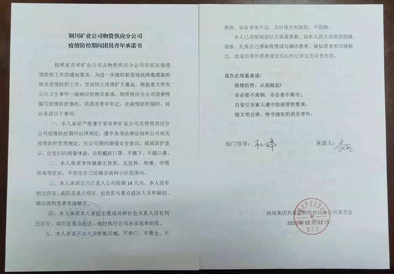 根據(jù)重大突發(fā)公共衛(wèi)生事件一級響應(yīng)的相關(guān)要求,該公司團(tuán)委組織團(tuán)員青年開展疫情防控線上總動員,人人做起寫好疫情防控承諾書,該公司53名團(tuán)員青年們主動跟所在團(tuán)支部簽訂疫情防控承諾書,紛紛表示,疫情防控,從我做起,非必要不離銅,非必要不離市,自覺倡導(dǎo)家人遵守防疫管控要求,做文明自律,恪守規(guī)矩的團(tuán)員青年,為疫情防控貢獻(xiàn)青春力量和青年正能量。