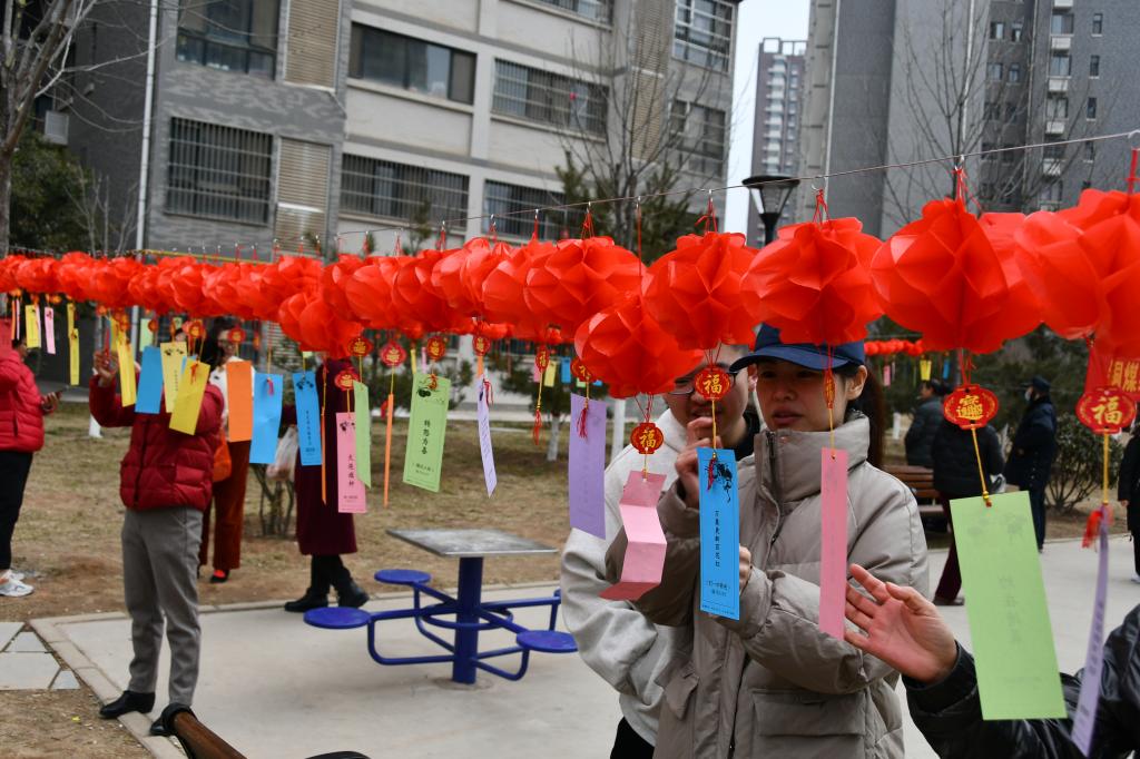 猜燈謎是元宵節(jié)傳統(tǒng)文化中必不可少的活動,起源于宋代,上千年來興盛不衰。大紅燈籠高高掛起,下面懸掛著各式各樣的燈謎,內(nèi)容包含成語、知識、生活等多個類別,并且巧妙地將部分黨的二十大精神融入到一個個生動有趣的燈謎當中,賦予了傳統(tǒng)燈謎文化新的時代內(nèi)涵。 居民們踴躍參與,開動腦筋,面對一道道謎語,時而苦思冥想,時而喜笑顏開,大家你一言我一語,在一次次謎底揭曉中傳遞文化,分享知識。