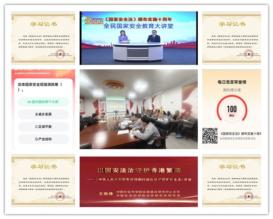 為深入學(xué)習(xí)領(lǐng)會(huì)習(xí)近平法治思想的重大意義、豐富內(nèi)涵、精神實(shí)質(zhì)和實(shí)踐要求,大力學(xué)習(xí)宣傳總體國(guó)家安全觀(guān),該中心明確學(xué)習(xí)內(nèi)容,緊扣“全民國(guó)家安全教育 走深走實(shí)十周年”主題,圍繞總體國(guó)家安全觀(guān)有關(guān)內(nèi)容,以觀(guān)看講座、線(xiàn)上答題和朗讀相結(jié)合,引導(dǎo)廣大職工通過(guò)掃描活動(dòng)二維碼,直接進(jìn)入答題環(huán)節(jié)參與只是競(jìng)答和朗讀活動(dòng),堅(jiān)持每日觀(guān)看一個(gè)講座片段、答一份競(jìng)賽試題,堅(jiān)持每日朗讀一個(gè)法條段落。全體參與活動(dòng)人員均獲得《2025年全民國(guó)家安全教育學(xué)習(xí)證書(shū)》。