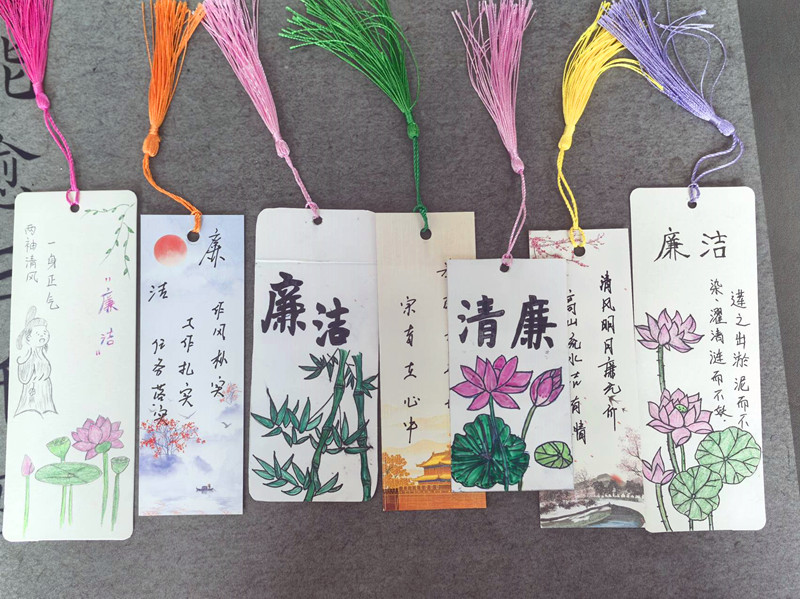 活動(dòng)現(xiàn)場(chǎng),黨員代表們發(fā)揮想象,各自選擇了跟“廉”有關(guān)的底稿,開始動(dòng)手實(shí)踐。經(jīng)過精心繪畫和書寫,一張張與廉潔有關(guān)的書簽作品展現(xiàn)在大家面前。有的寫著剛正不阿的“廉”字,有的以蓮花為題突顯一塵不染的廉潔之質(zhì),有的畫著“廉”與詩(shī)人的鮮明對(duì)比栩栩如生。