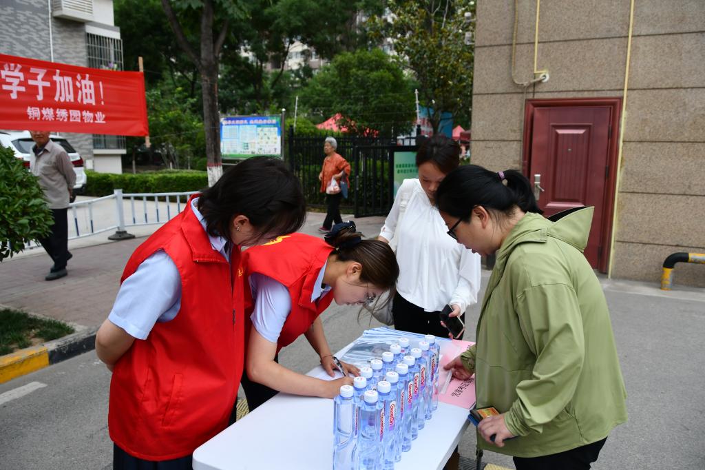 紅色愛心驛站,細節(jié)蘊聚溫情。高考不僅是知識的比拼,更是心態(tài)的較量。銅煤繡園物業(yè)的志愿者在一、二號小區(qū)門口分別設置愛心助力服務驛站,免費為考生及家長提供應急文具(2B鉛筆、橡皮、簽字筆)、瓶裝水、防暑降溫藥品(風油精、藿香正氣水)、口罩、紙巾等,以備考生不時之需。
