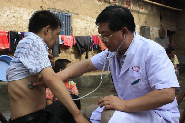 將近7點(diǎn)時(shí),終于走到了厙發(fā)學(xué)家里,顧不上休息,趙青瓊開(kāi)始為厙發(fā)學(xué)檢查身體。檢查中,趙青瓊發(fā)現(xiàn),厙發(fā)學(xué)是塵肺?、笃谥匕Y患者,已出現(xiàn)心臟衰竭和呼吸衰竭??吹匠钊轁M(mǎn)面的厙發(fā)學(xué),趙青瓊安慰他:“一定先按我說(shuō)的方案進(jìn)行治療,等你病情好轉(zhuǎn)后我會(huì)盡快安排你去醫(yī)院進(jìn)行治療。錢(qián)的事你就不用發(fā)愁了?!眳嚢l(fā)學(xué)看著趙青瓊,用力的點(diǎn)了點(diǎn)頭。短暫的體檢與交流后,趙青瓊和同事們便趕緊往回衛(wèi)生院的路上趕,8點(diǎn)之后,他們還有大量的工作要做?;貋?lái)的路上,趙青瓊一直拖著那只壞了的涼鞋艱難趕路,但想到厙發(fā)學(xué)不久將能進(jìn)入中央財(cái)政撥款首批被救助的名單里,覺(jué)得爛著腳走完這20多里的山路值了!趁著途中休息,他發(fā)了一條微博:“天剛亮雨就停了,旬陽(yáng)的山更綠了,又可以體檢更多的患者,好像老天爺也在獻(xiàn)愛(ài)心?!?/p>