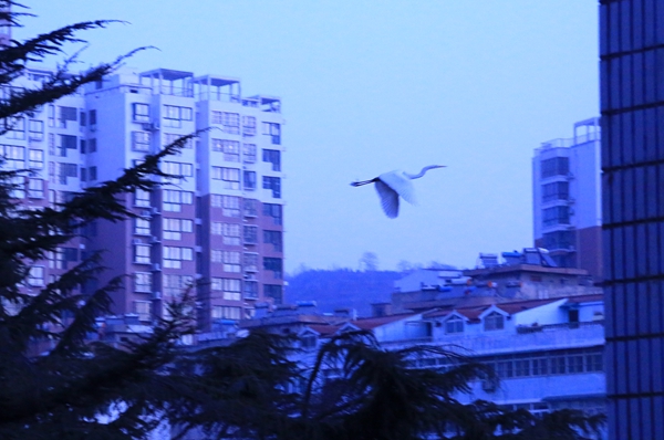 “大鳥”的到來是最近幾個月的事,最先觀察到這群“大鳥”的是公司晚上正在加班的一名同志,他看到了辦公室窗外雪松上竟然落了一群白顏色的大鳥,于是,拍攝了一張照片錯認為是朱鹮發(fā)在微信群里,并且附了一段文字:“晚上加班有朱鹮相伴?!?/p>