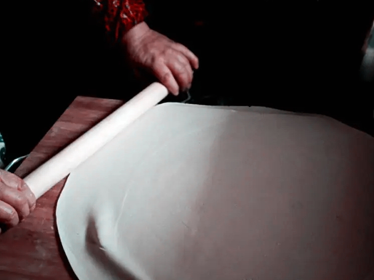 不一會功夫,等母親把纏繞在面杖上的面皮攤開時,一張又薄又圓,大如折扇形狀的面皮鋪在了碩大的面板上。母親用刀劃成幾綹,一綹一綹地疊在一起,只聽見“噠噠噠”刀與面板的撞擊聲,母親動作嫻熟,麻利地切成了均勻等寬的長條。