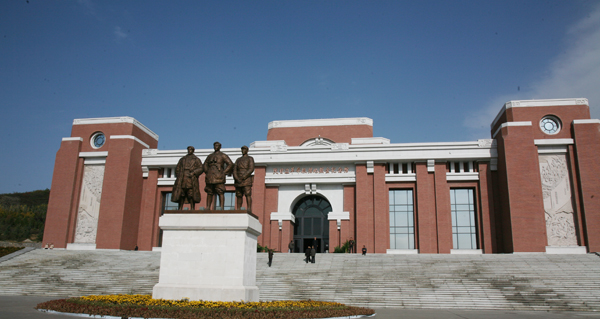 離照金村越來越近,一排排為村民們新建的紅色樓房盡收眼底,周圍環(huán)境優(yōu)美,空氣清新,仿佛置身度假山莊。汽車一轉(zhuǎn)彎,我們到達了照金紅色革命根據(jù)地展覽館。放眼望去,對面的山坡上高高的矗立著白色的人民英雄紀(jì)念碑,頂部正中鑲嵌著大大的一顆紅五星,寬闊的廣場上有許多身穿藍色的紅軍軍裝,頭戴紅五星軍帽的紅軍戰(zhàn)士正在敲鑼打鼓變換隊型,一問才知道原來是照金村民正在舉辦首屆運動會開幕式。
