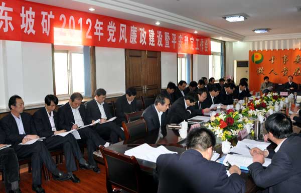 3月29日,東坡礦召開2012年度黨風(fēng)廉政建設(shè)暨平安穩(wěn)定工作會。該礦黨政主要領(lǐng)導(dǎo)、機(jī)關(guān)副科級以上干部、基層各單位主管、書記共計(jì)70余人參加了會議。會議由東坡礦副礦長兼總工程師龔永安主持。