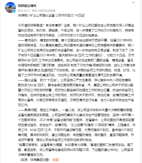 高效組織,精準(zhǔn)安排部署。第十四屆運(yùn)動會近期將于西安開幕,恰逢2021年中秋、國慶假期將至,為認(rèn)真落實(shí)集團(tuán)公司紀(jì)委有關(guān)通知精神及公司黨委有關(guān)部署要求,銅川礦業(yè)公司充分發(fā)揮紀(jì)檢監(jiān)察機(jī)關(guān)監(jiān)督職能,進(jìn)一步做細(xì)做實(shí)日常監(jiān)督,制定下發(fā)了《關(guān)于做好十四運(yùn)暨2021年中秋、國慶期間糾治“四風(fēng)”工作的通知》,對助力十四運(yùn)、雙節(jié)期間糾治“四風(fēng)”工作做出紀(jì)律要求。全公司各紀(jì)檢監(jiān)察部門靠前監(jiān)督、精準(zhǔn)監(jiān)督,督促協(xié)調(diào)相關(guān)職能部門履行職責(zé),結(jié)合實(shí)際,制定了行動方案,明確目標(biāo)任務(wù)、細(xì)化工作責(zé)任多措并舉,落實(shí)責(zé)任,迅速掀起了行動熱潮。進(jìn)一步推動各項(xiàng)工作順利推進(jìn),找準(zhǔn)、盯住、化解了工作環(huán)節(jié)中的廉潔風(fēng)險(xiǎn),為加快公司高質(zhì)量發(fā)展?fàn)I造風(fēng)清氣正的發(fā)展環(huán)境。