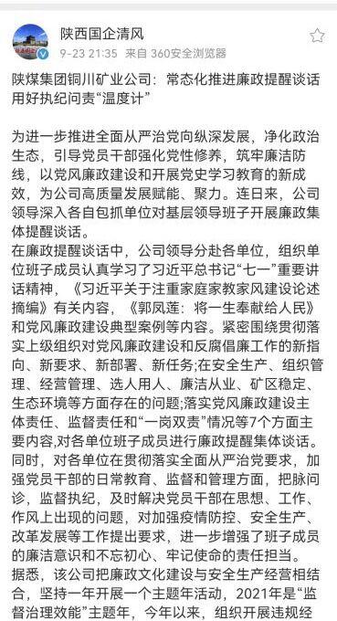 在廉政提醒談話中,公司領導分赴各單位組織單位班子成員認真學習了習近平總書記“七一”重要講話精神,《習近平關于注重家庭家教家風建設論述摘編》有關內(nèi)容,《郭鳳蓮:將一生奉獻給人民》和黨風廉政建設典型案例等內(nèi)容,并緊密圍繞貫徹落實上級組織對黨風廉政建設和反腐倡廉工作的新指向、新要求、新部署、新任務;在安全生產(chǎn)、組織管理、經(jīng)營管理、選人用人、廉潔從業(yè)、礦區(qū)穩(wěn)定、生態(tài)環(huán)境等方面存在的問題;落實黨風廉政建設主體責任、監(jiān)督責任和“一崗雙責”情況等7個方面主要內(nèi)容,對各單位班子成員進行廉政提醒集體談話。同時,對各單位在貫徹落實全面從嚴治黨要求,加強黨員、干部的日常教育、監(jiān)督和管理方面,把脈問診,監(jiān)督執(zhí)紀,及時解決黨員干部在思想、工作、作風上出現(xiàn)的問題,對加強疫情防控、安全生產(chǎn)、改革發(fā)展等工作提出要求,進一步增強了班子成員的廉潔意識和不忘初心、牢記使命的責任擔當。