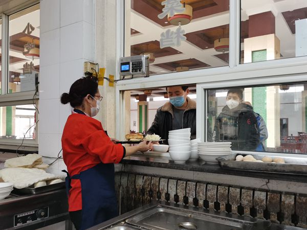 在食堂大廳,她們及時提醒大家做好個人防護,保持1.5米排隊距離,吃飯前在摘下口罩,還為取餐的職工提供打包服務,取完即走,有效減少人員聚集。