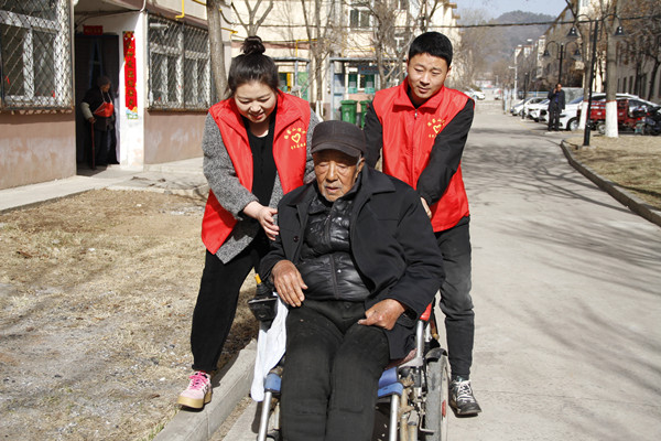 “張大爺,我們又來了,最近身體怎么樣?”青年志愿者高鳳與黃鑫推著輪椅邊走邊詢問。張大爺黝黑的臉上露出了淳樸的笑容。