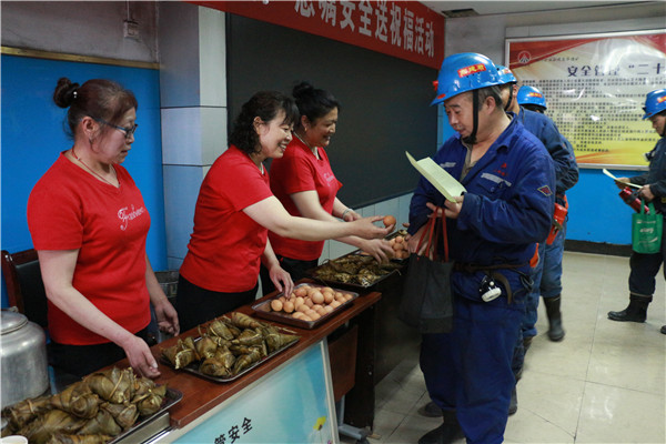 “師傅,端午節(jié)快樂(lè)!吃個(gè)粽子吧”,“天氣熱了,大家喝杯降溫茶,注意防暑!”,“祝您節(jié)日快樂(lè)!井下要注意安全??!”……,6月7日,適逢端午佳節(jié),又是全國(guó)第18個(gè)“安全生產(chǎn)月”活動(dòng)火熱開(kāi)展之際,玉華煤礦候罐大廳里迎來(lái)一群“特殊客人”,家屬安全協(xié)管員和團(tuán)員青年志愿者為即將下井工作的職工們送來(lái)了香氣四溢的粽子和飽含親情的安全叮囑。
