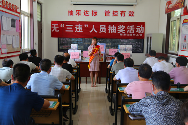 “下面請防火隊(duì)上半年無“三違”職工孫文斌、朱安迪、耿自賓……上前進(jìn)行領(lǐng)獎?!彪S著2022年上半年度無“三違”人員參與答題活動,獲取抽獎機(jī)會,以及獎項(xiàng)的一一揭曉,臺下時(shí)不時(shí)響起一片熱烈的掌聲。這是近日陳家山煤礦舉辦無“三違”人員安全知識答題現(xiàn)場的場景。